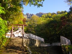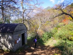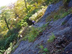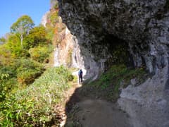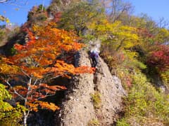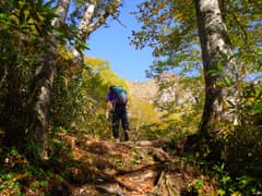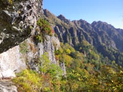 社務所の左手から登山道に入ると、樹林帯の中の急登となる。紅葉は色付き始めた頃合いで、緑とブナの黄葉の取り合わせが青空に映えて鮮やかだ。ところどころ樹林の隙間から戸隠山の主稜線を見上げることができる。頭上に岩壁が現れ、短い鎖場を登ると五十間長屋に着く。岩壁が回廊のように掘り込まれた奇観だ。