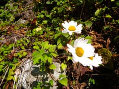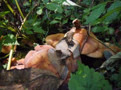 と思っていたら、キノコがありました!草に隠れた湿った倒木にナラタケが群生。Mさんも狂喜乱舞。通りがかった地元?のキノコに詳しいあんちゃん(やはり、キノコを取っていた)の話によると、ヤブタケともいうらしい。ちょっと時期が遅くて「流れた」ものが多いが、それでも食べ頃のものがビニル袋いっぱいに取れた。