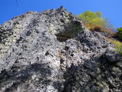岩壁の基部を左に回り込むと、百間長屋がある。こちらも奇観で、雨が凌げるほど大きな庇の下を通る。庇の出口付近は岩壁が崩落し、登山道にも落下した岩屑が散乱しているので、注意しつつ急いで通り抜ける。