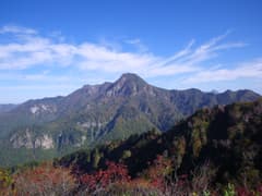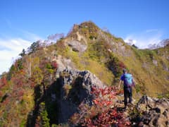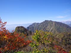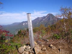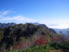 小さなアップダウンを繰り返す。石盤の中央に十字が刻まれた三角点?のあるピークが九頭龍山のようだ。一旦下り、急坂を登ると最後のピークで、紅葉の間から高妻山と北アが眺められる。ここからひとしきり下って、一不動に着いた。