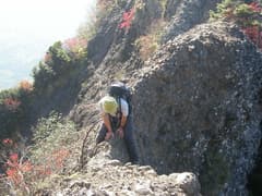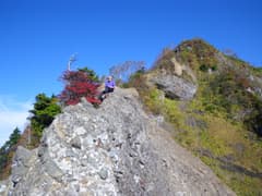 次の20mの鎖場を登ると、左手に鎖が掛かった岩峰がある。Mさんはこれにもチャレンジ。岩の上にすっくと立つ。うーん、敵わん(^^;)