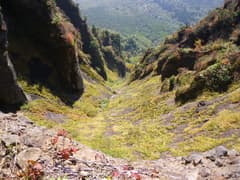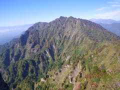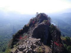 胸突き岩を登りきって小ピークに立つと、いよいよ「蟻の塔渡り」が始まる。幅50cm、長さ20mのナイフリッジで、両側は断崖絶壁。特に左側はオーバーハングした約150mの絶壁で、高度感満点。絶対に下は見れない。ふらついたが最後、摑まる物がなく落っこちるので、四つん這いになって進む。最後は下り坂で特に狭い「剣の刃渡り」となる。距離は5m程と短いが、難関だ。とにかく慎重に、馬乗りになって越えざるを得ない。渡りきったときには、心底ホッとした。