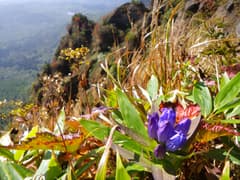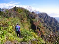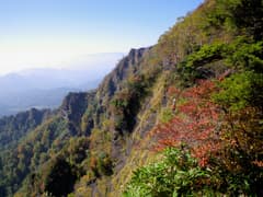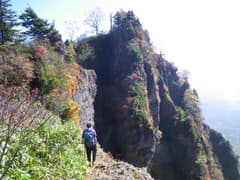 空は秋らしく晴れ渡り、木々は紅葉し、展望は断崖絶壁を見おろして変化に富む。この縦走路は楽しい。崖の縁にもリンドウが咲いている。遥か下には、奥社の屋根が白く光っていた。