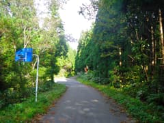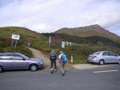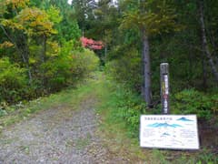 八ッ森コースの入口には道標があり、路側に車が1台停まっていた。ここから杉の植林帯の中の未舗装の林道に進入する。道が右に曲がる角にもう1台が車があり、2組のハイカーさんが登っているようだ。さらに真っすぐ延びる林道を上がると終点の車止めに着き、道標と登山案内の看板がある。僅かに1台分の駐車スペースがあり、運良く空いていた。