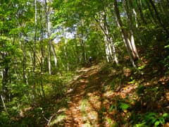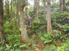 車を置いて登山道を歩き出す。杉林の中を真っすぐに登り、ブナ林に入って山腹をジグザグに登る。緩くて歩き易い道だ。