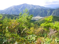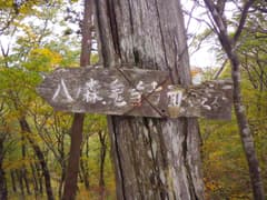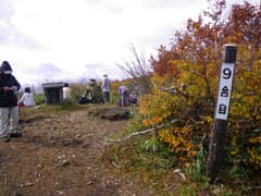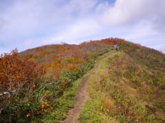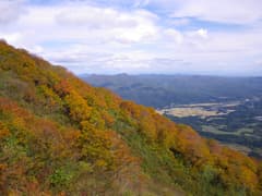 樹林に入って、ようやく風が弱まる。8分程歩くと1合目、さらに8分程緩く登ると2合目の標識がある。この調子なら頂上まで1時間半くらいかな(実際にそれ位だった)。黄葉したブナ林の尾根を登って3合目を過ぎると、再び禿岳の頂上稜線を望むことが出来る。東麓に広がる牧場やゴルフ場、昨日登った荒雄岳の眺めも開ける。