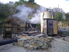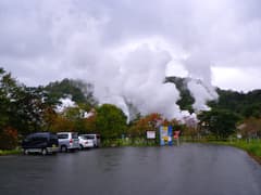 観光道路に出て、ついでに荒雄岳の地獄を巡る。まず、鬼首地熱発電所のある片山地獄。白い砂地が広がる谷間から蒸気がもうもうと立ち上がり、ゴーという轟音が響く。発電所の展示館(無人、無料)を見学した。