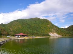 既に正午を回っているので、今日は極々軽い山歩きにする。車で温泉街を抜けて裏山に登り、ローカルなスキー場、ゴルフ場、テニスコートの傍を通って、山上の潟沼(かたぬま)に着く。湖畔にはレストハウスや広い駐車スペースがある。湖に面してぽっこり盛り上がった山が、今日の山歩きの対象の胡桃ヶ岳だ。