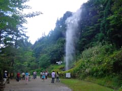 今夜の宿は、鬼首温泉郷の一つ、吹上温泉の峯雲閣だ。すぐ手前には有名な間歇泉があるので、観光して行く(400円)。僅かに湯気の立つ間歇泉の前に陣取って待つことしばし。突然、ドラゴン花火の様に熱湯が高く吹き出した。これは見事。