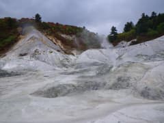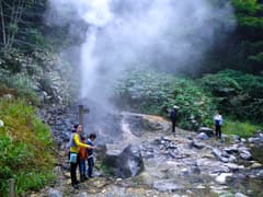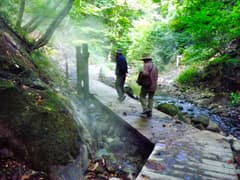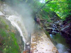 今日はまず、峯雲閣のすぐ近くの地獄谷(別名、地獄沢)に向かう。朝早いにも関わらず、地獄谷遊歩道入口の駐車場には観光客の車が集まり始めていた。木道を下ると、吊り橋の架かる小さな渓谷がある。これが地獄谷だ。川岸の崖のあちこちから湯気が上がり、熱湯がゴボッ、ゴボッと間歇的に湧出している。珍しい景観だ。源泉にはそれぞれ雷の湯、紫地獄などと名前が付いている。木道脇の源泉で、卵を入れた籠を熱湯に沈めて温泉卵を作っている人もいた。沢を遡り、木道の終点から引き返した。
