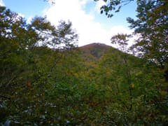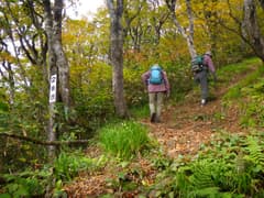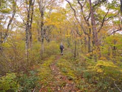 ブナに覆われた尾根に出ると、木の間から荒雄岳の頂上が見える。しばらく平坦な尾根を歩く。ブナの黄葉が綺麗だ。