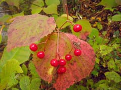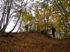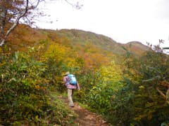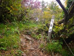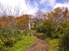 湖畔から5分も歩くと峠を越え、R47古川方面と鳴子町内の分岐の案内標識を見る。この右の杉林の中の踏み跡が胡桃ヶ岳への道だ。意外と明瞭な踏み跡で、藪漕ぎもない。やがて紅葉した低木の中の登りとなり、なかなか好ましい。