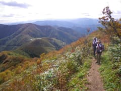 4合目から5合目の間は、お助けロープを摑んで急坂を登る。ここを上がり切ると見晴らしの良い痩せ尾根となる。振り返ると、花立峠からの稜線も一望だ。