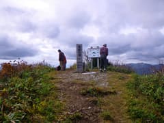 草原が広がる平坦な稜線を歩くと、僅かな距離で禿岳頂上に到着した。頂上からは360度の展望が得られ、大きな石柱の山名標識と、展望を解説した案内図がある。ただし、この案内図は概略過ぎて、どれがどの山か判らない(^^;)。北には栗駒山、須金岳、虎毛山辺りの山が見えているようだ。西には最上町の平野を見おろす。風を避けてパンを食べたのち、頂上を辞す。下山は往路を戻る。