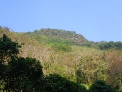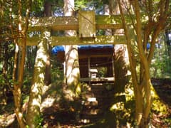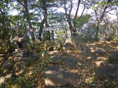 桐生を車で発ち、足利市葉鹿町を経由して粟谷町に向かう。行く手には台形の右肩が小さく三角に持ち上がった端正な山容の深高山が望まれる。刈り取りの終わった田んぼが広がる谷を進み、林道粟谷・松田線に入って最奥の民家を過ぎると、両側から山肌が迫って急に山奥の雰囲気に包まれる。溜め池の堰堤を過ぎ、林道の分岐に杉林に囲まれて山神社があった。すぐ手前の路側のスペースに車を置く。