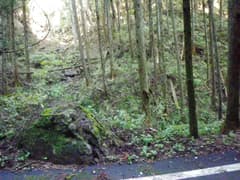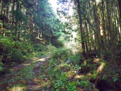 山神社から左の林道須花沢線に入る。薄暗い杉林の中、小さな沢に沿った未舗装道を15分も進むと終点となり、その先は林道の痕跡を進む。ところどころ林が切れて、露岩を配した急峻な山肌の上に石尊山〜深高山の稜線を仰ぎ見る。