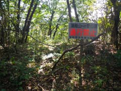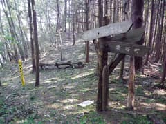 登り着いた鞍部は樹林に覆われている。左の稜線は湯殿山に通じているが、大規模な採石場に接する個所があるため通行禁止になっている。石尊山〜深高山の稜線を目指して右の急斜面を登り始めると、赤ペンキや古いトラロープがあって、かつては良く歩かれたコースだったようだ。藪もなく、稜線上の「湯殿山への登山道通行禁止」という看板が立つ地点に登り着いた。厳密にいうと通行禁止の道の一部を通ったことになる訳だが、採石場とは関係ない区間なので無問題だろう(もちろん、一般ハイキングコースではない)。