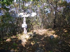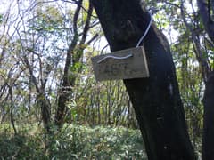最後に短い坂を登ると、深高山の頂上に到着した。頂上の石祠も折れた枝の直撃を危うく逃れていた。以前は南面に展望が得られたが、木が成長して遮られてしまっていた。簡易なベンチに腰を下ろして、缶ビールとサンマ蒲焼き缶を空ける。今日は行程が短いので、ビールと言ってもキリンフリー。あんまり美味いと思わないが(^^;)、飲んでる気分は出る。これで結構お腹が膨れたので、昼食はなしにして下山にかかる。