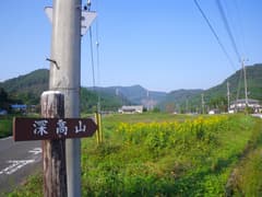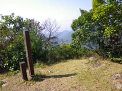 鞍部から少し登ると419.6mピークに着く。三角点(点名:松田)の標石と標高を記したR.K氏のプレートがある。この山には名前はないのかしらん。丸々太ったジョロウグモの巣を払いつつ稜線上の巡視路を辿ると林道粟谷・松田線に出て、深高山が眺められる。