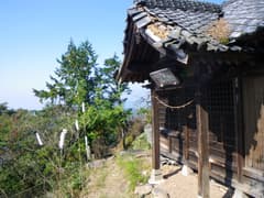 一段下に石尊宮が建つ。傍らの枯れたアカマツが台風で折れ、石祠がいくつか壊れていたが、石尊宮の社殿には幸い影響がなかった(しかし、瓦はだいぶ痛んでいる)。石尊山のすぐ前は急崖で、眼下には採石場、その向こうには小俣方面の展望が広がる。
