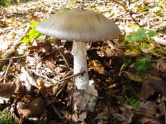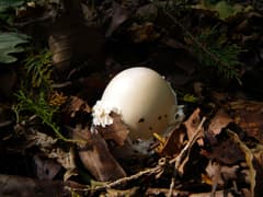 見晴らし台からUターンして、深高山に向かう。雑木林に覆われた平坦な稜線が続き、のんびりとプチ縦走が楽しめるいいコースだ。台風のせいか、青いままの落ち葉が多いなあ、などと道の脇を見ていたら、でっかいキノコを発見!傘の差し渡しは20cm近くある。立派なツボとツバを持っているところを見ると、テングタケ科のキノコかな。これは怖くて手が出ない。傘の表面は滑らかで、縁に明瞭な線条がある。付近を探すと、タマゴ状の幼菌もあった。これも握り拳くらい大きい。いやー、珍しいものを見ました(^^)
