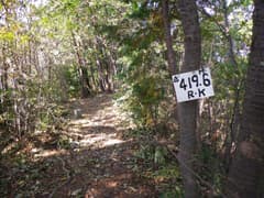 予定では、巡視路をずっと辿って下の林道粟谷・松田線まで降りる計画だったが、ここでルートを間違えて、143号鉄塔から支尾根を下る。まあ、道がないのは承知だが、樹林が疎らで下れそうだったので、ついつい。最後はかなり急な斜面となるが無事に下り着き、沢を渡って林道に出た。林道を下るとすぐに巡視路の入口があり、「141号に至る」と書かれていた。どうも142号と141号鉄塔をショートカットしたらしい。