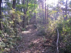 トラロープが張られた急坂を下ると、鞍部の十字路に着く。左は猪子峠、右へ下れば山神社だが、途中から林道粟谷・松田線の歩きになるのがあまり嬉しくないので、直進して稜線を辿る。送電線(新栃木線)の巡視路になっていて、明瞭な歩道が通じている。