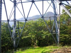 林道を横断し、道標に従って再び巡視路に入る。144号鉄塔を過ぎ、稜線を辿って143号鉄塔に向かう。台風で落ちた枝葉が多いが、雑木林に囲まれた良い道だ。143号鉄塔は稜線から支尾根を少し下った所にあり、鉄塔基部から深高山が垣間見える。