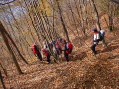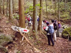 リーダーがインストラクターになってストレッチをして身体をほぐしたのち、登山道に入る。今日は暖かく穏やかなハイキング日和だ。杉林の中の急坂を登ると、すぐに暑くなって汗をかく。しばらく登ったところの水場で最初の休憩をとる。