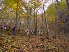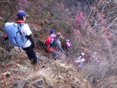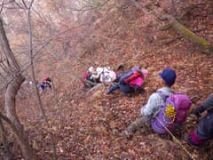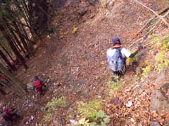 稜線から左へ、これまた急な斜面を下る。一部、踏み跡が不明瞭で迷い易い個所があるが、今日はリーダーについて歩いているので安心だ。長い隊列では、後方からの落石に注意。ロープに摑まって岩場を下ると、気が抜けない難所はようやく終わる。