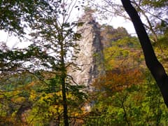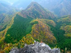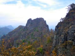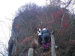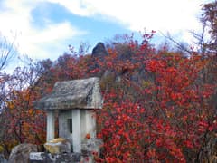 岩場には石祠が祀られ、ツツジの類いの紅葉が鮮やかだ。岩場の突端は恐ろしい高度差の断崖絶壁で、下を覗き込んで写真を撮るとクレしんの作者さんの悲運が脳裏をよぎる。つれづれさん、そんな先っぽまで平気で行っているけど、見ている方が怖いよ〜(^^;)