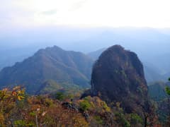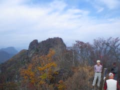 見晴らしのよい岩稜に出て少し登ると二ノ岳の頂上に着いた。頂上の西の少し開けた稜線上で大休止して、昼食となる。私はガソリンコンロで鍋焼きうどんを作って食べる。つれづれさんの煮物とデザートの果物も頂き、Yさん差し入れの柿もここで1個皮を剝いて食べた。食べるのに忙しくて、隣りの岩峰(展望が良い)に行きそびれた(^^;)。南側に一ノ岳の異形な岩峰とMHCのお二方が登っている四ッ又山、北側に下山ルートの稜線と遠方に連なる物語山を眺めて写真に収めているうちに出発の時刻となった。