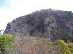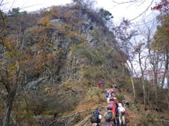 水場から少し上がると薄暗い杉林を抜けて、明るい雑木林の斜面を登る。頭上には木の間越しに一ノ岳の岩峰が仰がれる。小さな岩場を登って、二ノ岳とのコルに着いた。