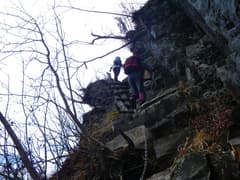 コルから少し二ノ岳よりの小平地にザックをデポし、デジカメだけを携えて一ノ岳を往復する。木の梯子を上がり、急斜面を登る。左側はすっぱり切れ落ちた岩壁で、なかなか高度感があるところだ。
