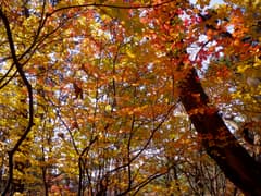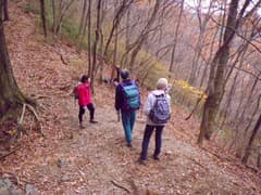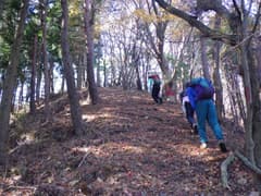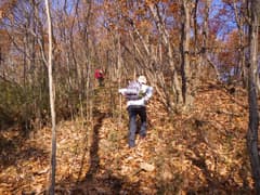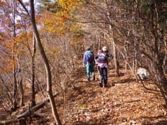 栗生山からはヒノキ林と雑木林に挟まれた尾根を辿る。整備された登山道ではないが、藪も薄くなって歩きやすい。紅葉に日差しが当たって、終盤の輝きを見せていた。途中、道に沿って大きな杉が一列に並んでいる場所があり、参道の杉並木のようにも思える。