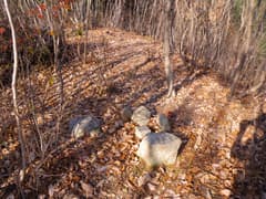 三峰山頂上に引き返し、金沢峠に向かう。途中、縦走路から寄り道して、枝尾根上のピークに立ち寄る。何か宗教モニュメントがあるかもと期待したが、雑木林に囲まれた静かな頂きがあるだけだった。