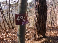 再び樹林に入って、眺めのない尾根を緩く登ると、四等三角点が置かれた標高494mの小ピークを通り過ぎる。点名は金沢だが、特に山名はないようで、R.K氏の標高プレートが木の幹に掛けられているだけである(2013-04-16追記:494m三角点峰は筬沢山(おさざわやま)と呼ぶそうである)。赤松が混じる雑木林の尾根が続き、落ち葉をカサコソと踏んで登る。