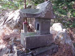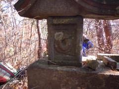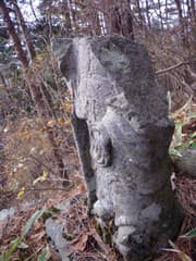 頂上で昼食をとったのち、三十六童子の下端の石像まで再び見に行く。Mさんによると右下の写真の像が三笠山大神で、この下の岩場にある八海山大神と、三峰山頂上の座王権現がトリオを組んでいるそうな。石像・石祠の類はどれもこれも古く見えるが、三十六童子のひとつの金剛童子の石塔には「安政三丙辰」(1856年)と彫り込まれているから、妙見宮より約30年新しい。この間に三峰山にいろいろな信仰が集まってきた社会的な背景にも興味が湧く。