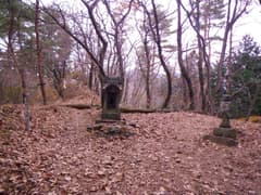 妙見宮を過ぎて右側に伐採地を見ると痩せ尾根となり、小さな岩場を越えると、次の石祠が現れる。屋根の前面には「三峰山」、土台には「眷属守護」と彫り込まれており、秩父三峰山から分地された三峰山信仰の奥の院にあたる祠だ。奥の院からは短いがかなりの急坂となり、息を切らせて登りきると三峰山頂上に飛び出た。