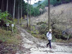 金沢峠からは梅田側に下る。鏡石を再び見るが、だんだん曇って来て、日の光の反射は見えない。杉林の中をジグザグに下るとすぐにコンクリート舗装の林道に出て、かなりの急勾配で一直線に下って行く。杉林に囲まれた味気ない道なので、ここは登路にしない方が吉かも。