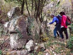露岩のある小ピークに登りつくと、石祠が鎮座ましまして待ち受けていた。小さい割に流造の屋根がぶ厚い立派な祠で、屋根の前面には「妙見宮」、土台には「村内安全」、「文政十二…十月吉日」と彫り込まれている(文政十二年=1829年)。また、祠の左右の側面には亀と蛇の浮き彫りがそれぞれ施されている。合わせて玄武(北の守り神)を表し、また、妙見とは北極星を信奉する信仰だそうだ。あまり見たことのないタイプの石祠で、面白い。一同、大変興味を持って、じっくり調査する。