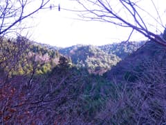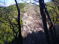 沢沿いの山道は、最近、多くの人が歩いたためか、踏み跡がしっかりした気がする。分岐点の少し手前で、谷の奥を眺めるために左岸の山腹を登ってみた。冬枯れの木立の間から八海山の尾根が見える。あの尾根に今日の目的の八海山大神と烏天狗があるはずである。