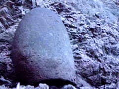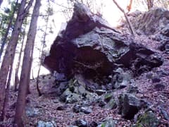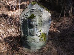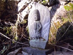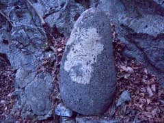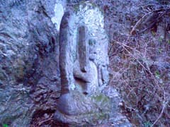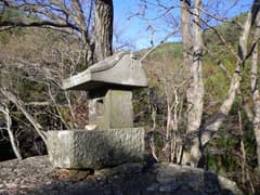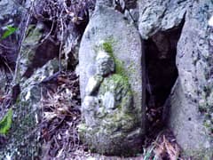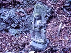分岐点にはハイトスさんが積んだケルンがあり、これが崩れない限り、真っすぐ行き過ぎることはないだろう。三本杉の石祠を通って、谷の奥に向かう。右手に沢が分かれる地点で、左手の岩場に前回見逃した如意輪観音を見る。桐生山野研究会のMさんが数度の探索で見つけ出したものだ。倒木の陰に隠れていたそうだが、Mさんが倒木を取り除いたので、今では難なく見つけられる。