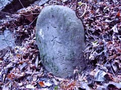 烏天狗から踏み跡を辿って三十六童子に向かう。途中、木立を透かして、深い谷の向こうに御嶽山の白い岩稜が見える。行場を左から越える前回のルートに合流して、杉林を登る。尾根の上に出ると、三笠山大神の石像がある。この近辺にあったという「八界山石杭」を探すが見つからない。Mさんも何度も探しているので、そう簡単には見つからないか。既に失われているのかも知れない。