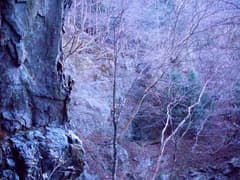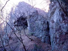 清浄の滝の左の岩壁には浅い岩屋があり、中に不動明王が置かれている。木々がすっかり葉を落としているので、岩屋の中から周囲の岩壁を見渡すことができる。