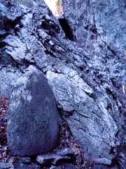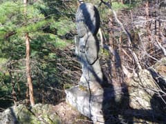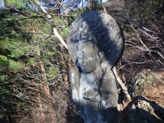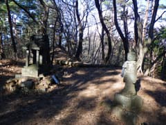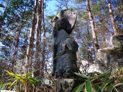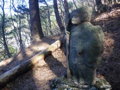 次は八海山大神に向かう。行場から如意輪観音まで戻って、右の沢に入る。道のない沢を暫く遡ると、左手に庇のある大岩がある。この庇に沿って登って行くと岩場があり、その突端に八海山大神が立っていた。ぐっと秀でたおでこから後方の円光になびく怒髪が、なんかファンキーな感じだ(^^;)。周囲は赤松などの樹林に覆われているが、冬枯れの木立の向こうに、赤城の地蔵岳が遠望できた。