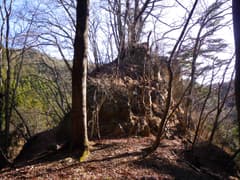 三峰山頂上から再び三十六童子を通って下り、御嶽山にあたる岩尾根を右から巻く。岩尾根の回りの樹林も葉が落ちて、木の間越しに三峰山から金沢峠にかけての稜線が眺められる。岩尾根の上の3基の石祠からの眺めも、前回より開けている。