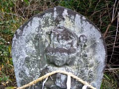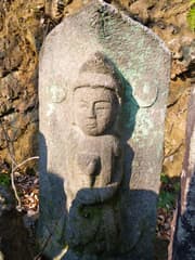 小平地の一角に大岩があり、その上にお目当ての石像があった。青銅色に苔むした石碑が隠す様に取り囲んでいるので、他の場所にあったものをここに集めたものらしい。それにしても変な置き方だ。石像の光背に刻まれた文字は「御月待供養塔」と読める。穏やかな表情で、素朴な感じのいい石像だ。
