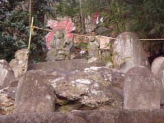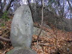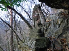 見上げる御嶽山は急峻な岩場となっていて、岩の窪みにも石像がある。桐生みどりご夫妻は例によって岩場を直登して石像に到達。代行さんと私は岩場を迂回して近づく。火炎に赤い彩色が残る不動明王だ。岩場には他に「大聖歓喜天」という文字塔もある。
