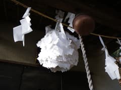 その上には矜迦羅童子・制吒迦童子を従え、真っ赤に彩色された火炎光背を持つ不動明王や、新しく立派な霊神碑がある。石段を登り切って鳥居を潜ると、落ち葉がふかふかに積もるこぢんまりとした境内があり、管理人のおじいさんが落ち葉を搔き集めて熾す焚き火の煙が立ち込めている。社殿の軒先には、籠を紙垂(しで)で覆った酒林(さかばやし)のようなものが下がっていた。これも初めて見るものだ。